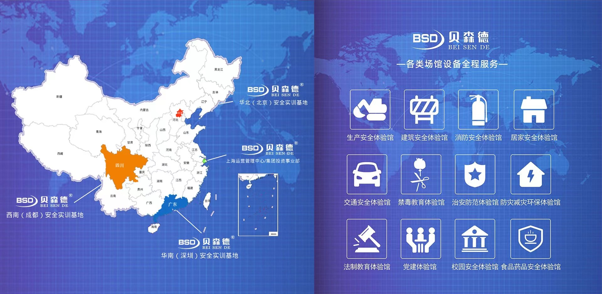 贝森德旗下有:贝森德、贝创科技、瓦令科技等品牌,主营业务由:体验式教育服务、绿色环保服务等构成。 提供各类场馆设备全程服务:消防体验馆、消防安全体验馆、生产安全体验馆、建筑安全体验馆、居家安全体验馆、交通安全体验馆、工地安全体验馆、VR安全体验馆、校园安全体验馆、食品药品安全体验馆、安全教育体验馆、禁毒体验馆、禁毒教育体验馆、治安防范体验馆、防灾减灾体验馆、法制教育体验馆、党建体验馆、模拟灭火体验、安全体验教室等。业务覆盖全国,主要覆盖上海、北京、深圳、四川成都、浙江、江苏、云南等地。